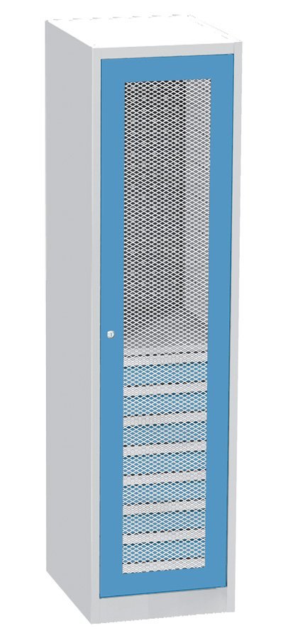 Jednodveřová dílenská skříň s drátěnými dveřmi v ocelovém rámu, šířka 505, výška 1950, hloubka 600 mm, 1 police, 8 zásuvek. Nosnost korpusu 800 kg, nosnost police 100 kg, nosnost zásuvky 50 kg. Barva korpusu RAL 7035 světle šedá.