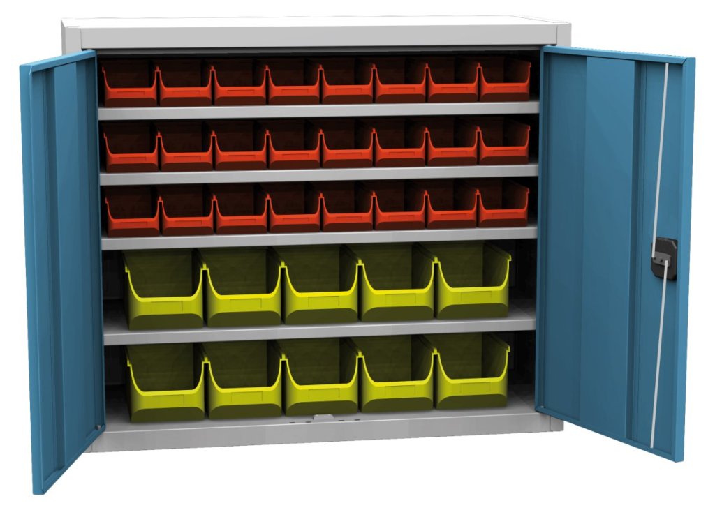 Dvoudveřová dílenská skříň s plastovými boxy (40), šířka 950, výška 1950, hloubka 400 mm. 9x police, 20x plastový box 456213 (š.205 x v.150 x hl.355 mm) a 20x plastový box 456214 (š.205 x v.150 x hl.355 mm). Možnost náhrady plných dveří dveřmi se skleněnou nebo drátěnou výplní.