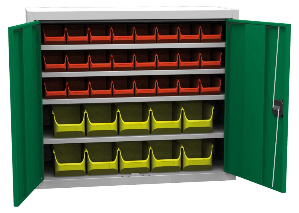 Dvoudveřová dílenská skříň s plastovými boxy (40), šířka 950, výška 1950, hloubka 400 mm. 9x police, 20x plastový box 456213 (š.205 x v.150 x hl.355 mm) a 20x plastový box 456214 (š.205 x v.150 x hl.355 mm). Možnost náhrady plných dveří dveřmi se skleněnou nebo drátěnou výplní.
