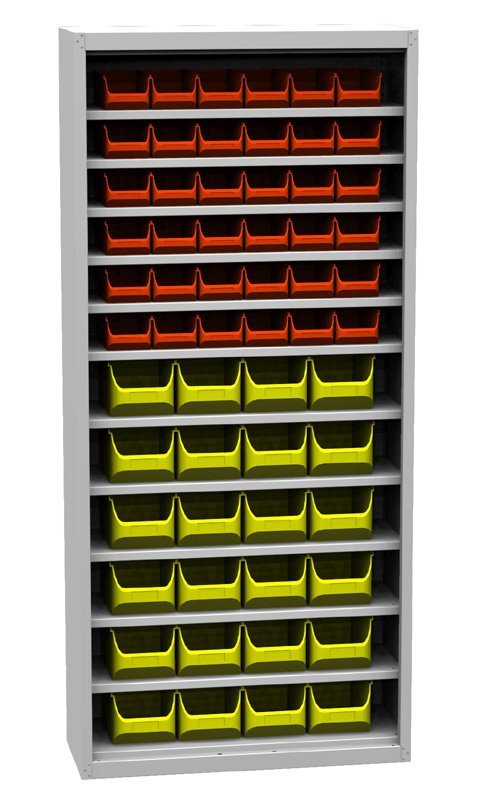 Dílenská skříň s plastovými boxy (40) - varianta bez dveří, šířka 950, výška 1950, hloubka 400 mm. 9x police, 20x plastový box 456213 (š.205 x v.150 x hl.355 mm) a 20x plastový box 456214 (š.205 x v.150 x hl.355 mm).