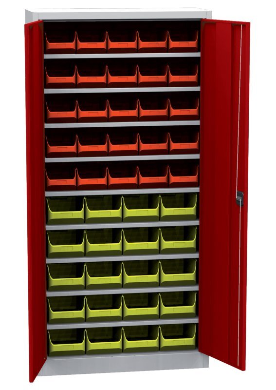 Dvoudveřová dílenská skříň s plastovými boxy (40), šířka 950, výška 1950, hloubka 400 mm. 9x police, 20x plastový box 456213 (š.205 x v.150 x hl.355 mm) a 20x plastový box 456214 (š.205 x v.150 x hl.355 mm). Možnost náhrady plných dveří dveřmi se skleněnou nebo drátěnou výplní.