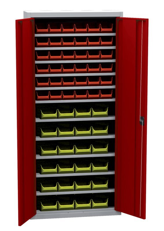 Dvoudveřová dílenská skříň s plastovými boxy (40), šířka 950, výška 1950, hloubka 400 mm. 9x police, 20x plastový box 456213 (š.205 x v.150 x hl.355 mm) a 20x plastový box 456214 (š.205 x v.150 x hl.355 mm). Možnost náhrady plných dveří dveřmi se skleněnou nebo drátěnou výplní.