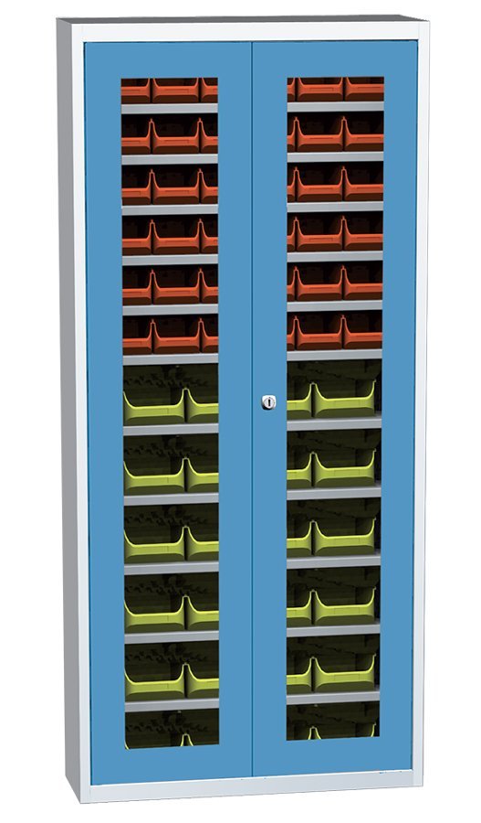 Dvoudveřová dílenská skříň s plastovými boxy (60), šířka 750, výška 1650, hloubka 300 mm. 11x police, 36x plastový box 456205 (š.75x v.102 x hl.160 mm), 24x plastový box 456242 (š.82 x v.137 x hl.160 mm). Skleněné dveře v ocelovém rámu. Barva korpusu RAL 7035 světle šedá.