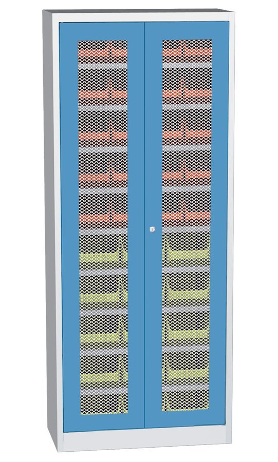 Dvoudveřová dílenská skříň s plastovými boxy (35), šířka 800, výška 1950, hloubka 400 mm. 9x police, 20 x plastový box 456209 (š.150 x v.125 x hl.235 mm), 15x plastový box 456214 (š.205 x v.150 x hl.352 mm). Drátěné dveře v ocelovém rámu. Barva korpusu RAL 7035 světle šedá.