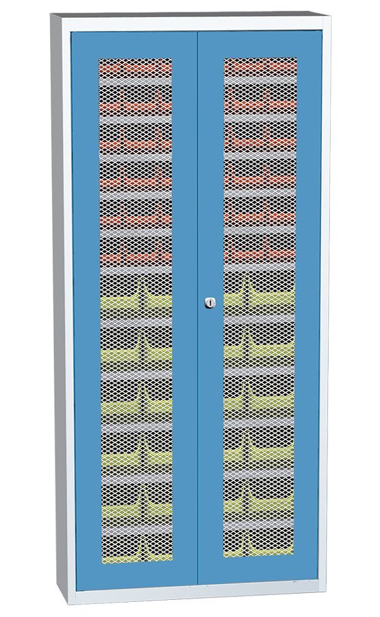 Dvoudveřová dílenská skříň s plastovými boxy (40), šířka 950, výška 1950, hloubka 400 mm. 9x police, 20x plastový box 456213 (š.205 x v.150 x hl.355 mm) a 20x plastový box 456214 (š.205 x v.150 x hl.355 mm). Možnost náhrady plných dveří dveřmi se skleněnou nebo drátěnou výplní.