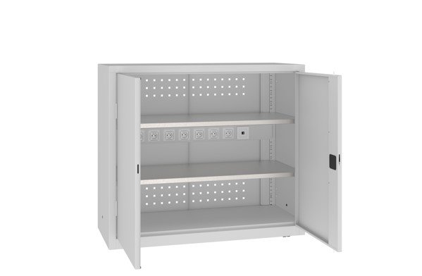 Dílenská skříň vybavená pěti 230 V zásuvkami v. 1040 x š. 1200 x h. 500 mm.
