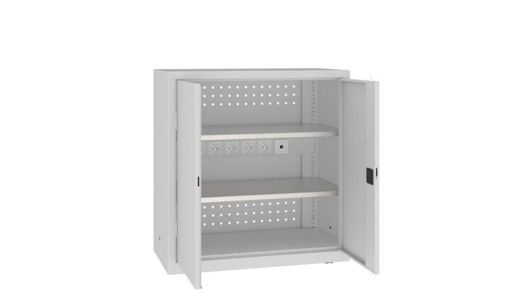 Dílenská skříň vybavená pěti 230 V zásuvkami v. 1040 x š. 1000 x h. 500 mm.
