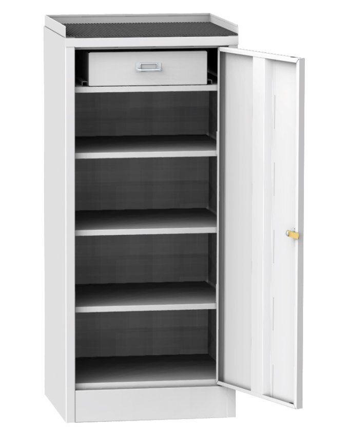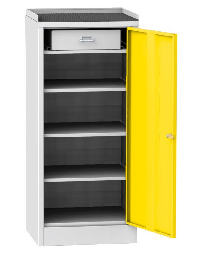 Dílenská skříňka na nářadí, šířka 500, výška 1030, hloubka 500 mm. Horní odkládací plocha s gumovou podložkou a s okrajem proti přepadnutí drobných předmětů. Barva korpusu RAL 7035 světle šedá.