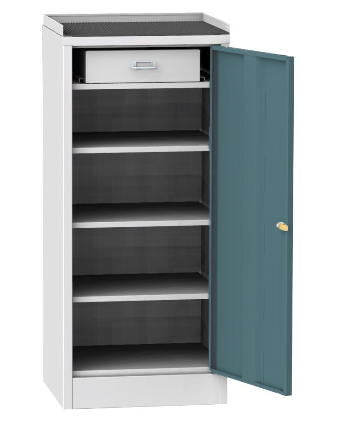 Dílenská skříňka na nářadí, šířka 500, výška 1030, hloubka 500 mm. Horní odkládací plocha s gumovou podložkou a s okrajem proti přepadnutí drobných předmětů. Barva korpusu šedá RAL 7035. Skladem v barvě dveří modrá RAL 5012.