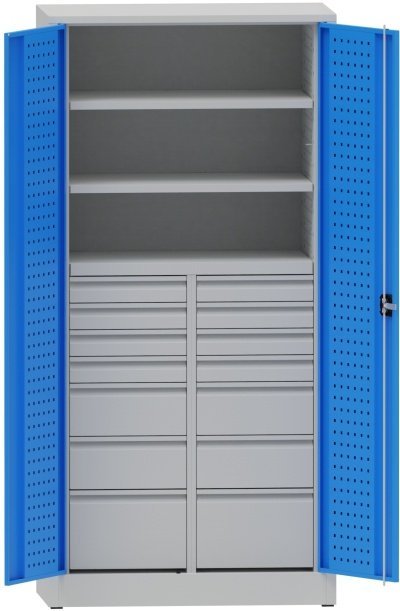 Dvoudveřová dílenská skříň economy s perfopanely. Výška 1950 x šířka 950 x hloubka 500 mm. Tříbodový rozvorový zámek, 3 stavitelné police, 10 zásuvek (90% výsuv). Barva korpusu RAL 7035 světle šedá, dveří RAL 7035 světle šedá, RAL 5005 modrá a RAL 5012 modrá.