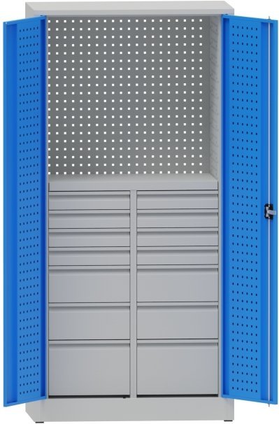 Dvoudveřová dílenská skříň, perforovaná záda a dveře. Výška 1950 x šířka 950 x hloubka 500 mm. Tříbodový rozvorový zámek, 14x zásuvka. Barva korpusu RAL 7035 světle šedá, dveří RAL 7035 světle šedá nebo RAL 5012 modrá.