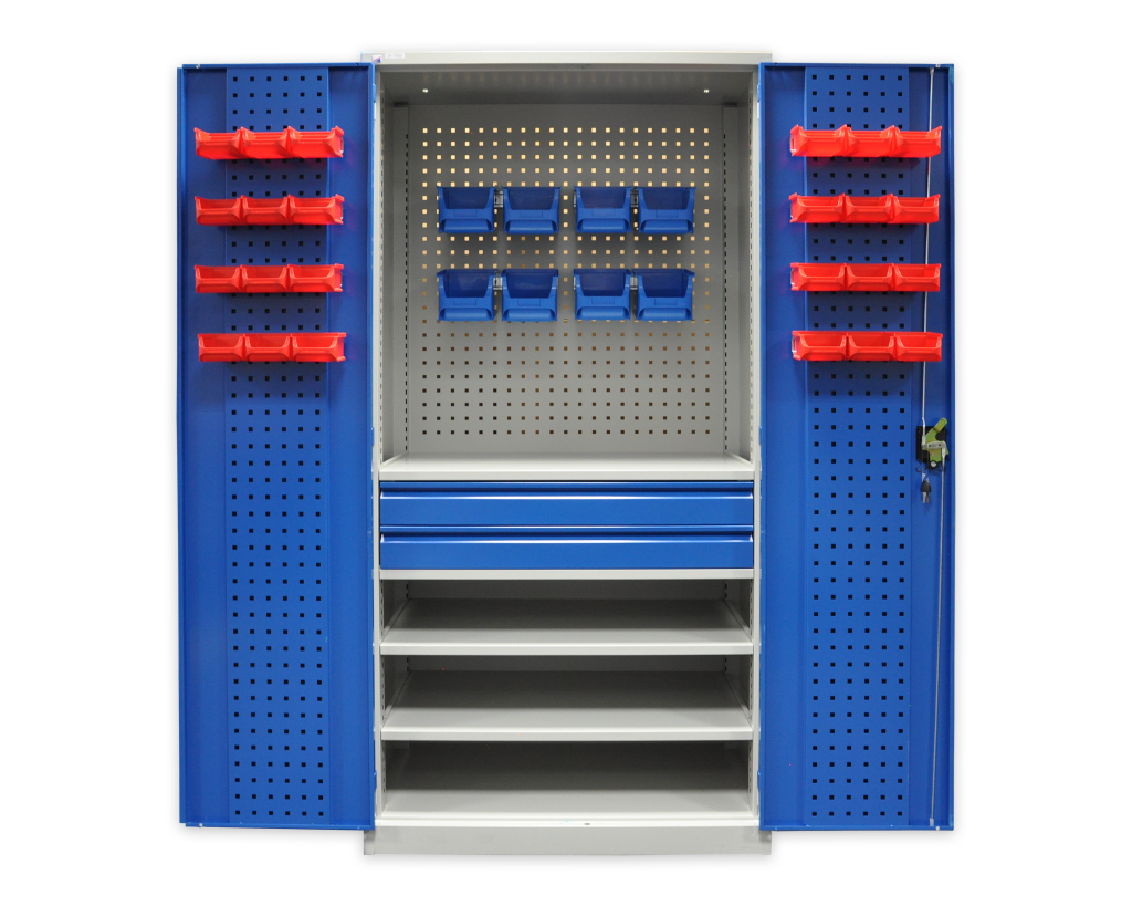 Dvoudveřová dílenská skříň s plastovými boxy, perforovaná záda (horní polovina) a dveře. Výška 1850 x šířka 920 x hloubka 500 mm. Tříbodový rozvorový zámek, 2x zásuvka. Barva korpusu RAL 7044 světle šedá, barva dveří RAL 5017 modrá.