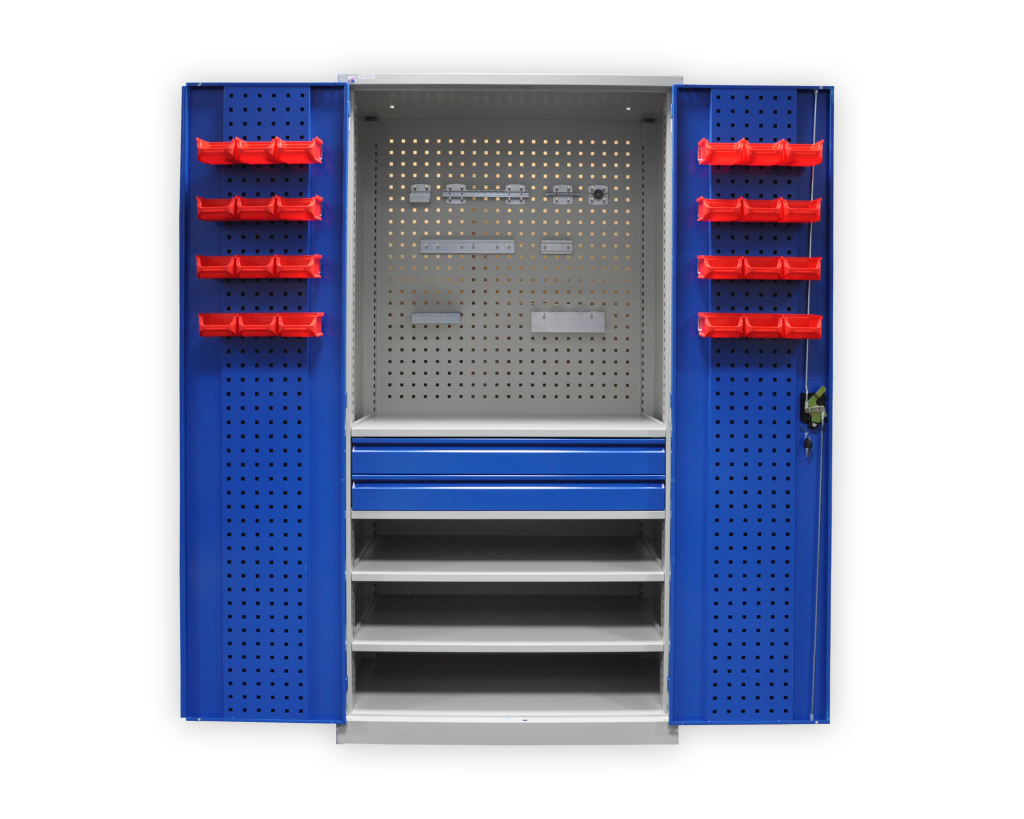 Dvoudveřová dílenská skříň s plastovými boxy, perforovaná záda (horní polovina) a dveře. Výška 1850 x šířka 920 x hloubka 500 mm. Tříbodový rozvorový zámek, 2x zásuvka. Barva korpusu RAL 7044 světle šedá, barva dveří RAL 5017 modrá.