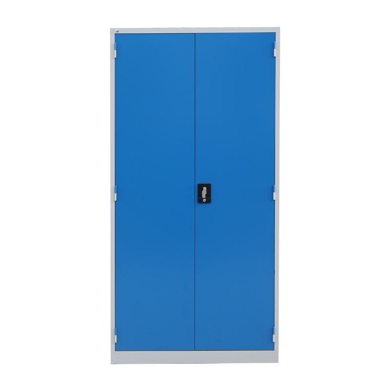 Dvoudveřová dílenská skříň, šířka 950, výška 1950, hloubka 600 mm, 4 police. Možnost náhrady plných dveří dveřmi se skleněnou nebo drátěnou výplní. Barva korpusu šedá RAL 7035. Skladem v barvě dveří modrá RAL 5012.