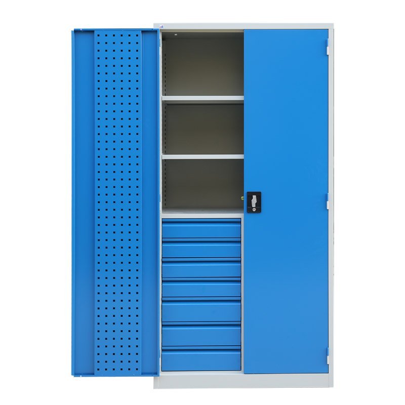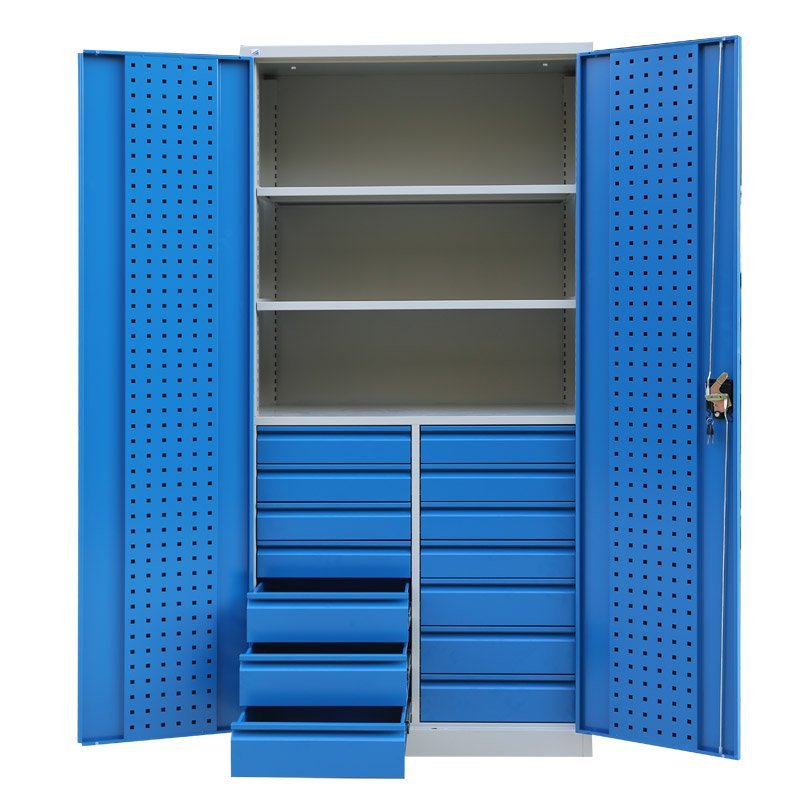 Dvoudveřová dílenská skříň economy s perfopanely. Výška 1950 x šířka 950 x hloubka 500 mm. Tříbodový rozvorový zámek, 3 stavitelné police, 10 zásuvek (90% výsuv). Barva korpusu RAL 7035 světle šedá, dveří RAL 7035 světle šedá, RAL 5005 modrá a RAL 5012 modrá.