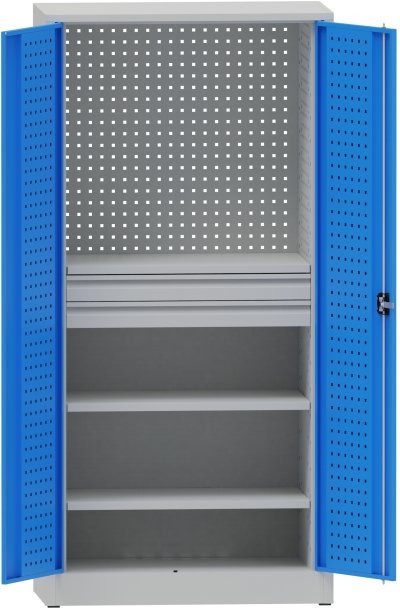 Dvoudveřová dílenská skříň, perforovaná záda (horní polovina) a dveře. Výška 1950 x šířka 950 x hloubka 500 mm. Tříbodový rozvorový zámek, 2x zásuvka, 2x police. Barva korpusu RAL 7035 světle šedá, dveří RAL 7035 světle šedá nebo RAL 5012 modrá.