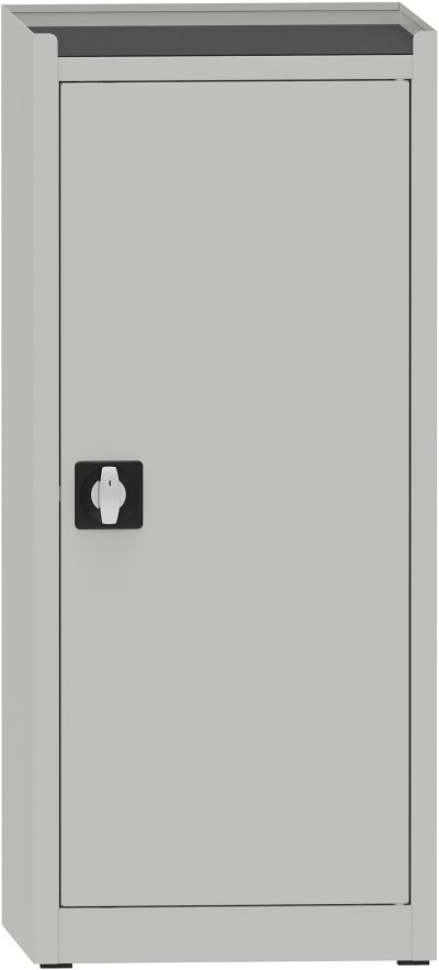 Jednodveřová dílenská skříň, šířka 505, výška 1950, hloubka 600 mm, 2 police. Možnost náhrady plných dveří rámem s tvrzeným sklem nebo drátěnou mříží pro lepší přehled o obsahu skříně. Nosnost korpusu 800 kg, nosnost police 100 kg. Barva korpusu RAL 7035 světle šedá.