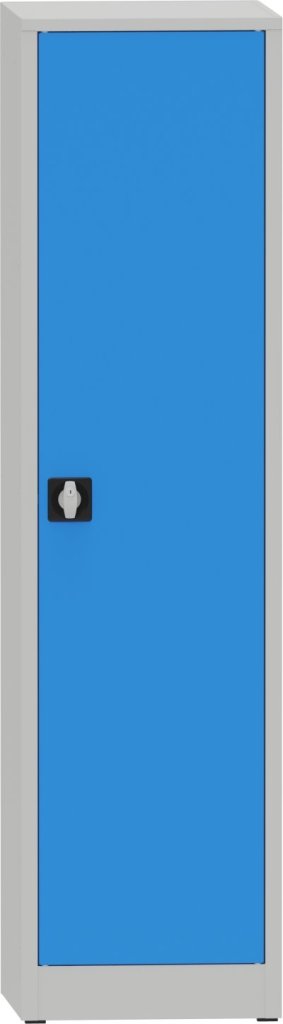 Jednodveřová dílenská skříň, šířka 505, výška 1950, hloubka 600 mm, 4 police. Možnost náhrady plných dveří rámem s tvrzeným sklem nebo drátěnou mříží pro lepší přehled o obsahu skříně. Nosnost korpusu 800 kg, nosnost police 100 kg. Barva korpusu RAL 7035 světle šedá. Skladem v provedení plné dveře, barva dveří modrá RAL 5012.