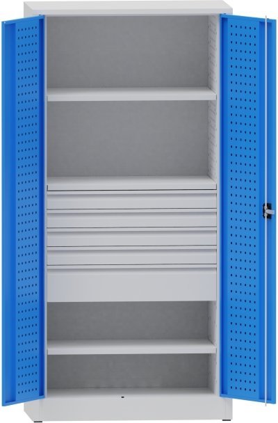 Dvoudveřová dílenská skříň economy s perfopanely. Výška 1950 x šířka 950 x hloubka 500 mm. Tříbodový rozvorový zámek, 3 stavitelné police, 6 zásuvek (90% výsuv). Barva korpusu RAL 7035 světle šedá, dveří RAL 7035 světle šedá, RAL 5005 modrá a RAL 5012 modrá.