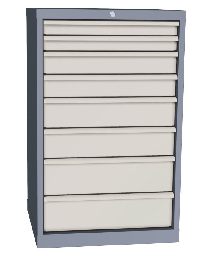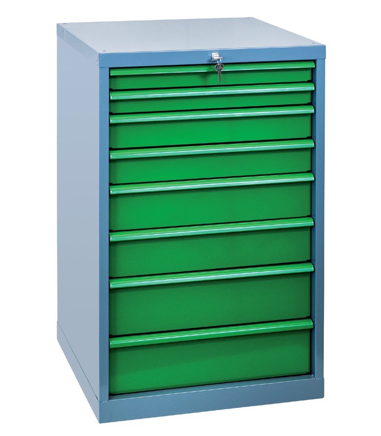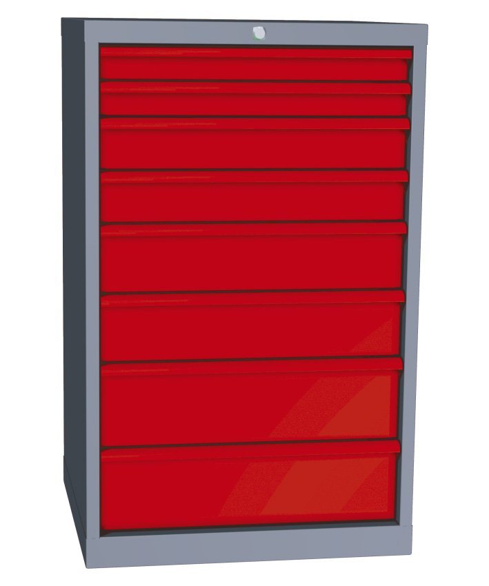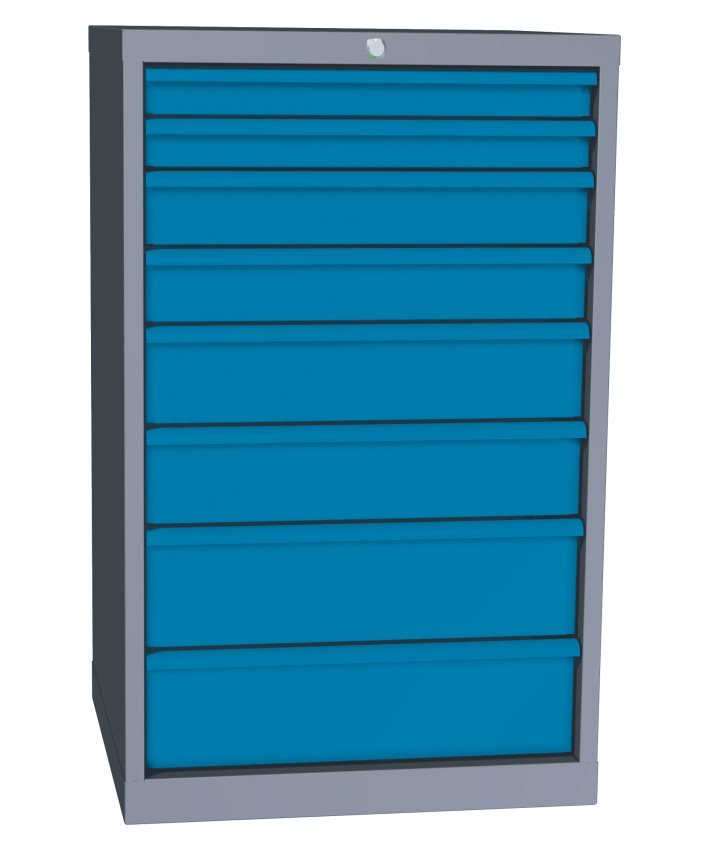 Osmizásuvková dílenská skříňka, šířka 620, výška 1000, hloubka 600 mm. Barva korpusu šedá RAL 7031, barva zásuvek zelená RAL 6001, modrá RAL 5012, červená RAL 3000, světle šedá RAL 7035 nebo žlutá RAL 1023. 2x zásuvka 60, 2x 90, 2x 120, 2x 150 mm.