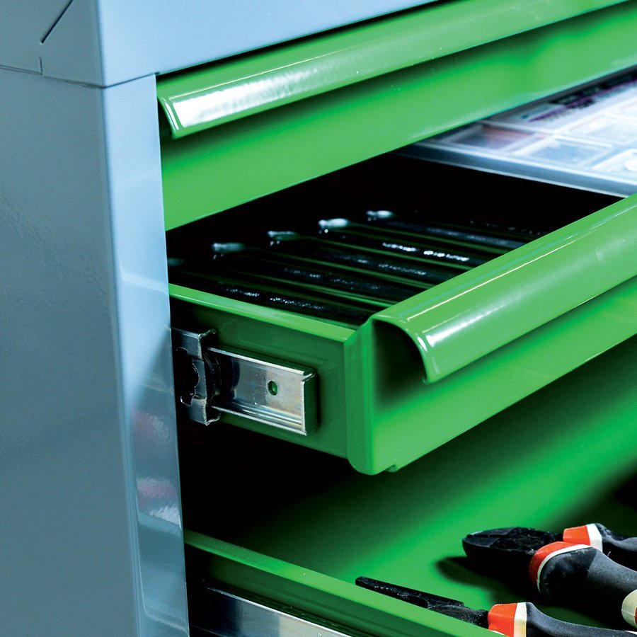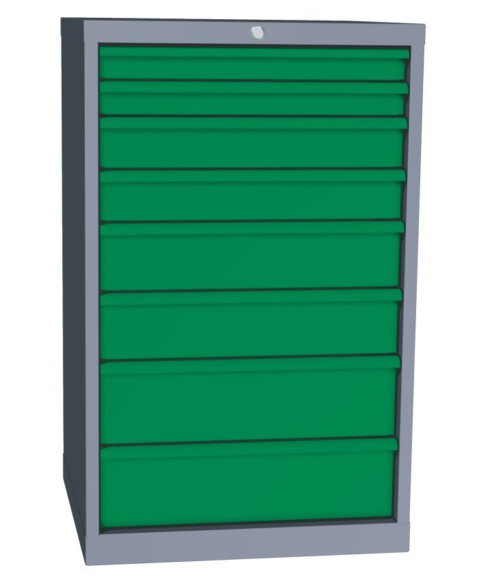Osmizásuvková dílenská skříňka, šířka 620, výška 1000, hloubka 600 mm. Barva korpusu šedá RAL 7031, barva zásuvek zelená RAL 6001, celý popis a parametry