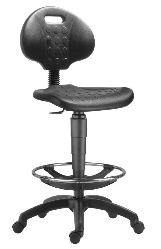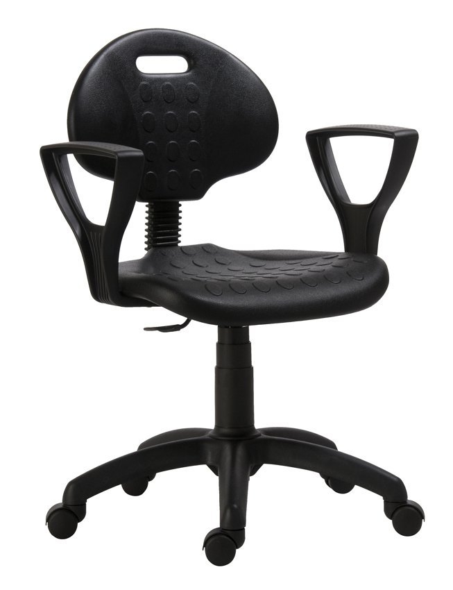 Jednoduchá polyuretanová pracovní židle s plynovým pístem k nastavení výšky sedáku, opěrák připevněn pomocí hokejky nebo kloubu s možností nastavení sklonu opěráku. Možnost doplnění loketními opěrkami.