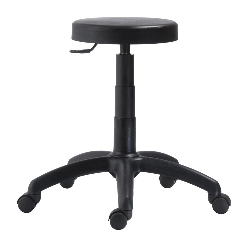 Polyuretanový taburet o průměru 32 cm, plynový píst. Kolečka nebo kluzáky, možnost zvýšeného sezení s kruhovou oporou pro nohy. Kříž plast nebo chrom.