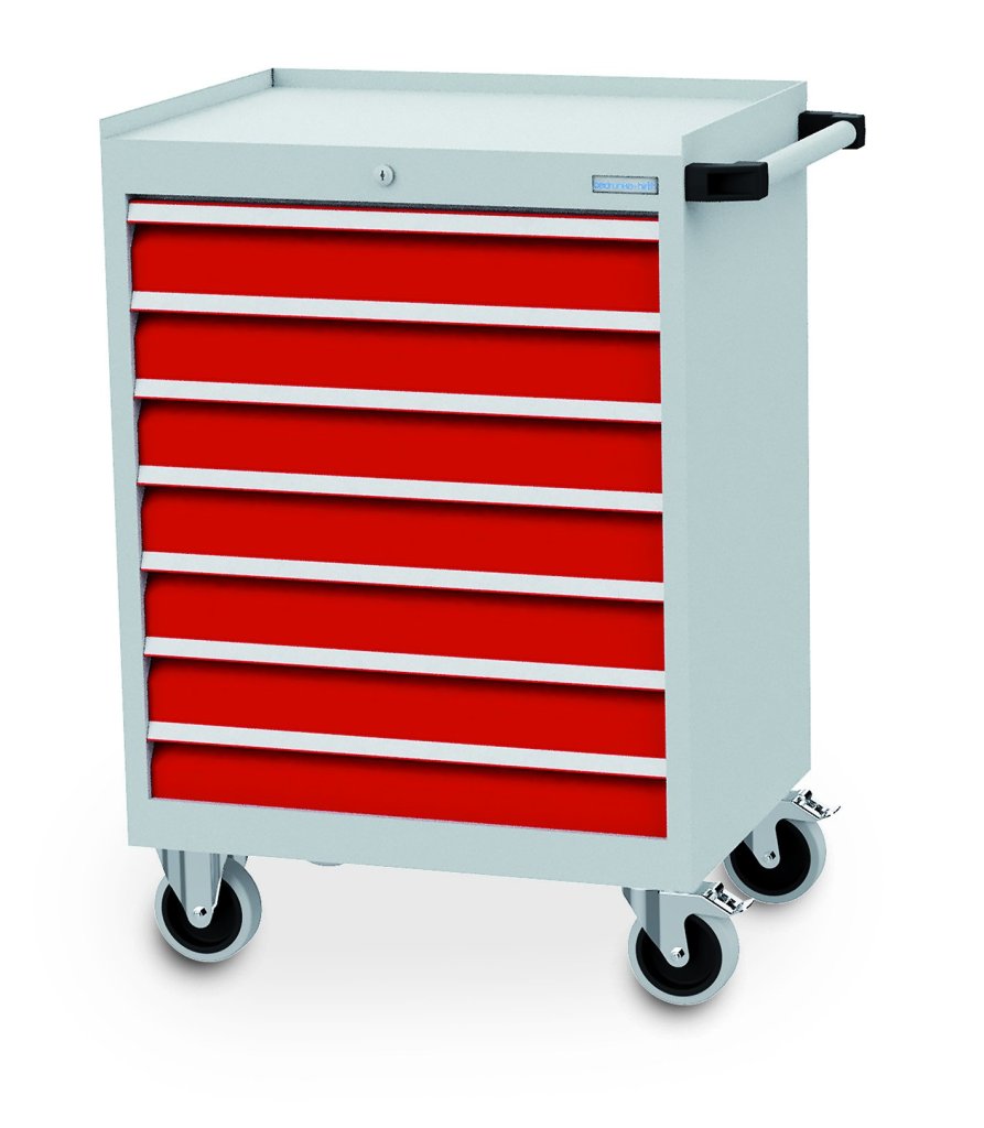 Dílenský servisní vozík, rozměry (V x Š x H) 1004 x 680 x 500 mm. 7x zásuvka 100 mm. 4 otočná kolečka, madlo. Barva konstrukce světle šedá, barva zásuvek na výběr. Dodáván ve smontovaném stavu.