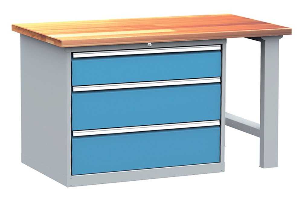 Dílenský stůl, sestava DPS 102, šířka 1500, výška 850, hloubka 750 mm. Sestava se skládá ze stolové desky z bukové spárovky 40 mm, kovové pevné nohy a trojzásuvkového kontejneru DPK 01A. Nosnost zásuvky 80 kg. Skladem v barvě korpus světle šedá, zásuvky modrá.