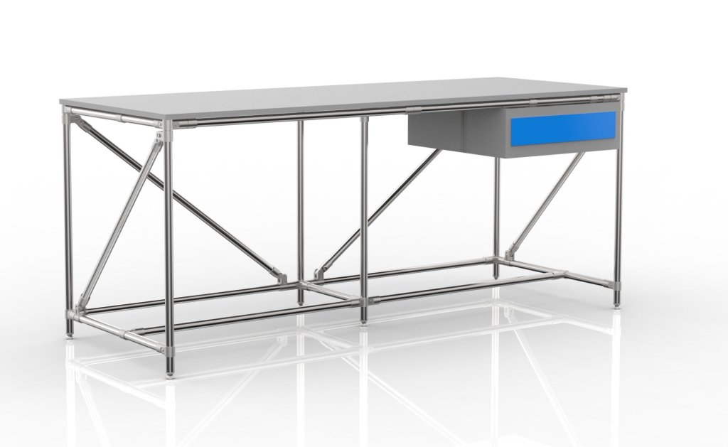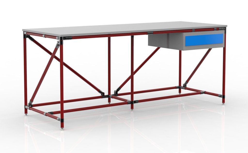 Dílenský stůl z trubkového stavebnicového systému s DTDL pracovní deskou tloušťky 18 mm, stolovým kontejnerem s jednou zásuvkou a čtyřmi stavitelnými nožičkami. Nosnost při rovnoměrném zatížení 100 kg. Rozměry 850 x 2000 x 750 mm.