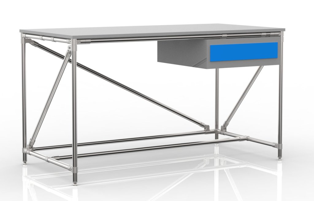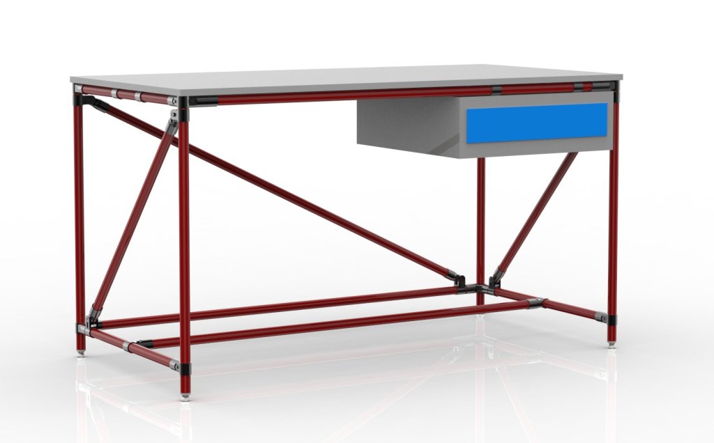 Dílenský stůl z trubkového stavebnicového systému. Součástí stolu je oboustranně laminovaná pracovní deska, stolový kontejner se zásuvkou a čtyři stavitelné nožičky. Nosnost při rovnoměrném zatížení 100 kg. Rozměry 850 x 1500 x 750 mm.