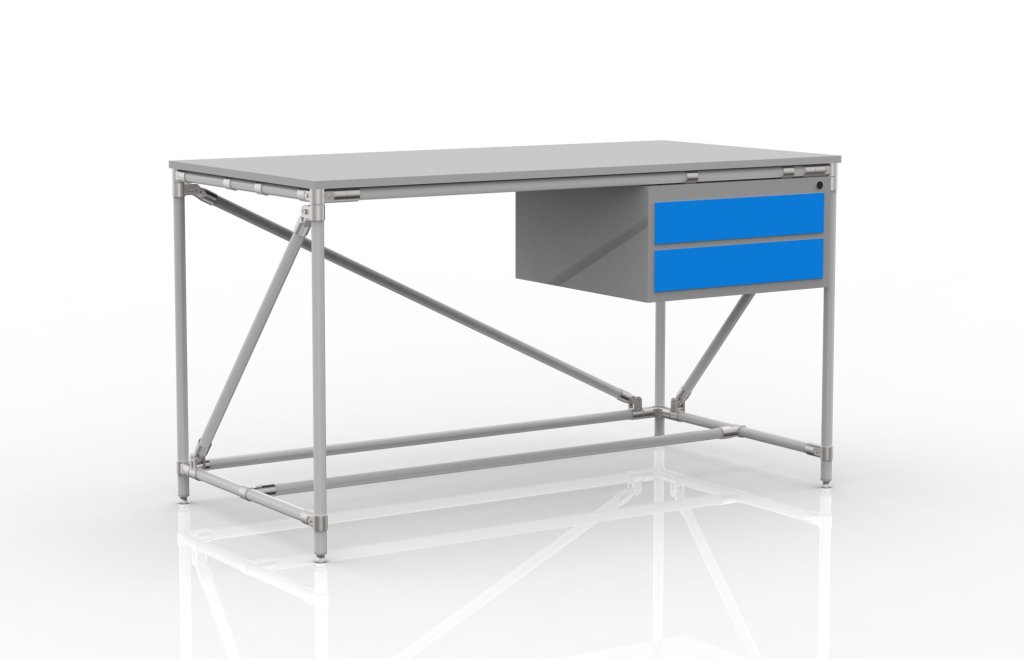 Dílenský stůl z trubkového stavebnicového systému s pracovní lamino deskou tloušťky 18 mm, stolovým kontejnerem se dvěma zásuvkami a čtyřmi stavitelnými nožičkami. Nosnost při rovnoměrném zatížení 100 kg. Rozměry 850 x 1500 x 750 mm.