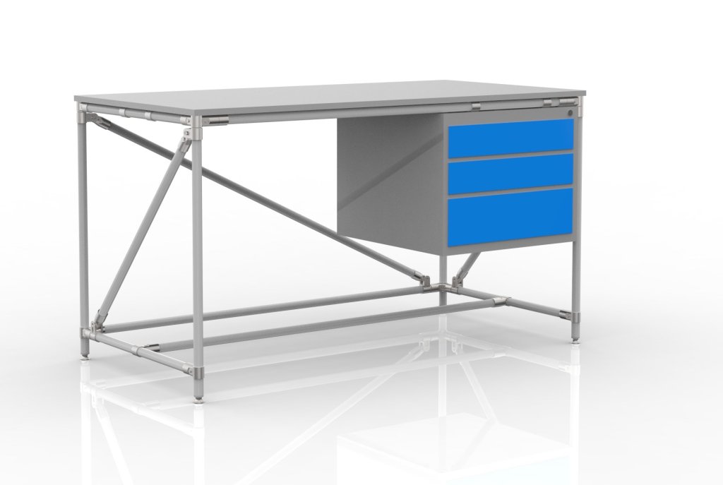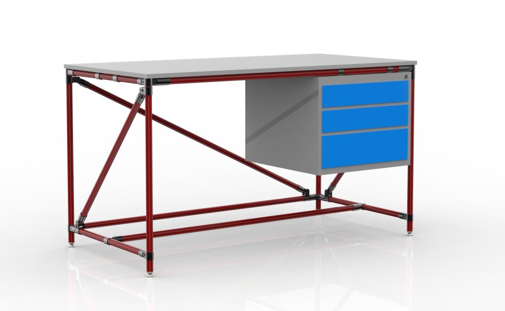 Dílenský stůl z trubkového stavebnicového systému s DTDL pracovní deskou tloušťky 18 mm, stolovým kontejnerem a čtyřmi stavitelnými nožičkami. Nosnost při rovnoměrném zatížení 100 kg. Rozměry 850 x 2000 x 750 mm.