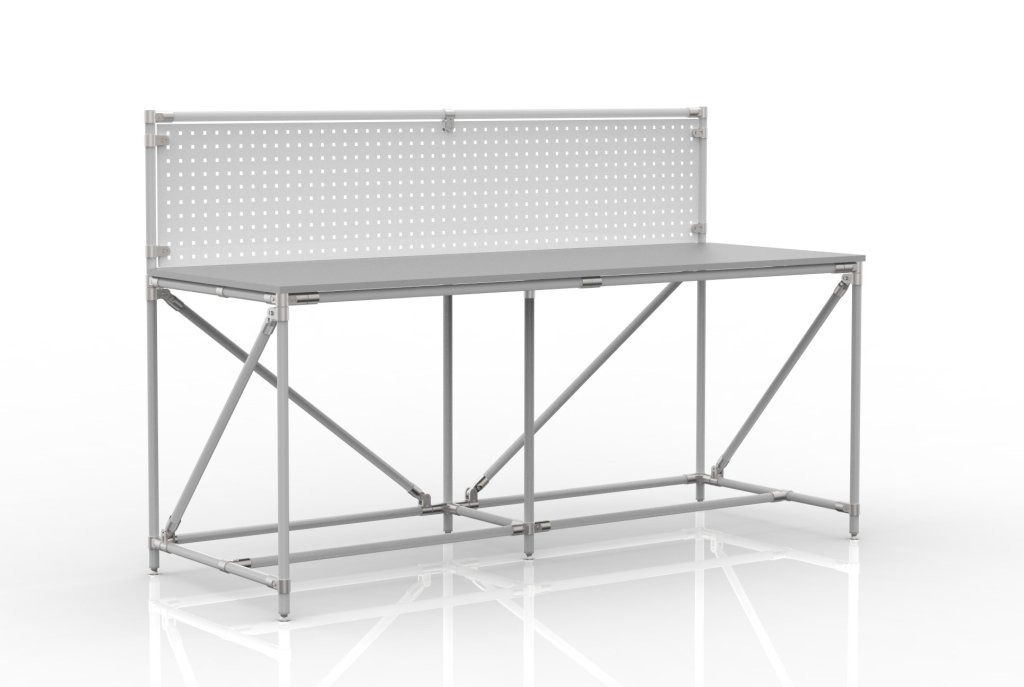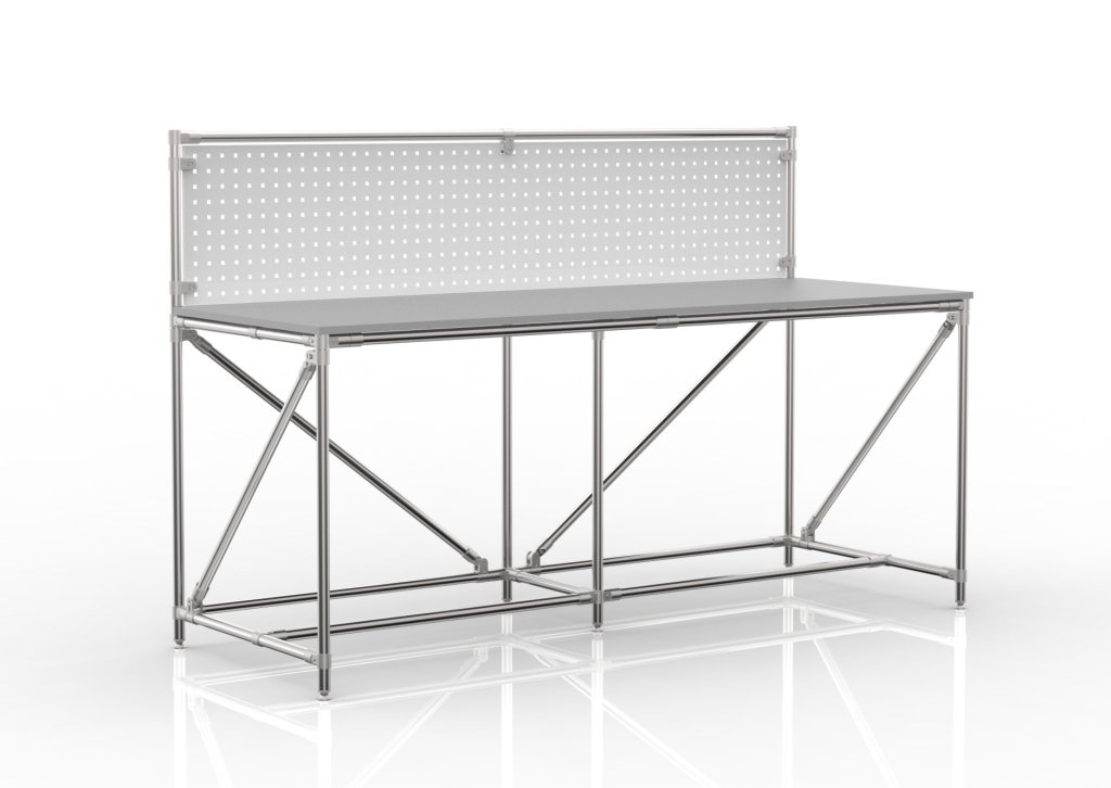 Dílenský stůl s perfopanelem z trubkového stavebnicového systému. Součástí stolu je dřevotřísková pracovní deska oboustranně laminovaná tloušťky 18 mm, perfopanel pro zavěšení nářadí či boxů a čtyři stavitelné nožičky. Nosnost při rovnoměrném zatížení 100 kg. Rozměry 1282 x 2000 x 750 mm.