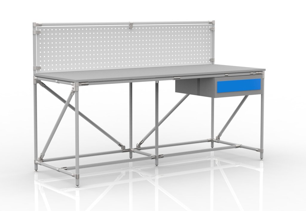 Dílenský stůl s perfopanelem z trubkového stavebnicového systému. Součástí stolu je dřevotřísková pracovní deska oboustranně laminovaná tloušťky 18 mm, stolový kontejner s jednou zásuvkou, perfopanel pro zavěšení nářadí či boxů a čtyři stavitelné nožičky. Nosnost při rovnoměrném zatížení 100 kg. Rozměry 1282 x 2000 x 750 mm.