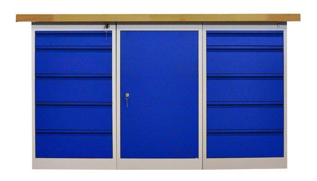Pracovní deska 40 mm vodovzdorná buková spárovka. 3x podstavný kontejner, výška 810, šířka 461, hloubka 600 mm. Stůl má nosnost 500 kg, výšku 850, šířku 1500, hloubku 750 mm, barva kontejneru šedá RAL 7035/modrá RAL 5010. Dvířka lze umístit na obě strany. Police jsou odnímatelné ale nepřestavitelné.