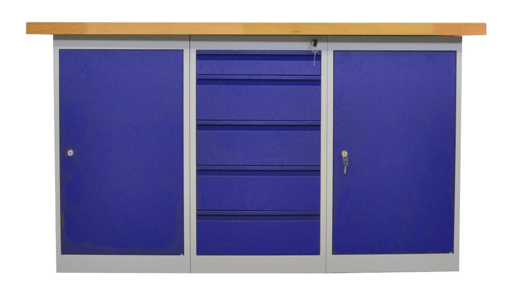Pracovní deska 40 mm vodovzdorná buková spárovka. 3x podstavný kontejner, výška 810, šířka 461, hloubka 600 mm. Stůl má nosnost 500 kg, výšku 850, šířku 1500, hloubku 750 mm, barva kontejneru šedá RAL 7035/modrá RAL 5010. Dvířka lze umístit na obě strany. Police jsou odnímatelné ale nepřestavitelné.
