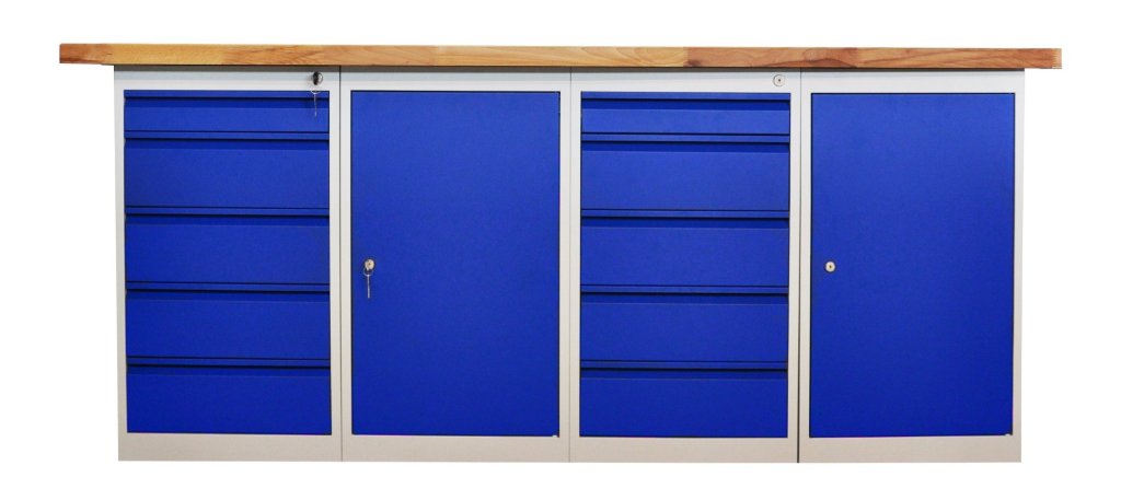 Pracovní deska 40 mm vodovzdorná buková spárovka. 4x podstavný kontejner, výška 810, šířka 461, hloubka 600 mm. Stůl má nosnost 500 kg, výšku 850, šířku 2000, hloubku 750 mm, barva kontejneru šedá RAL 7035/modrá RAL 5010.