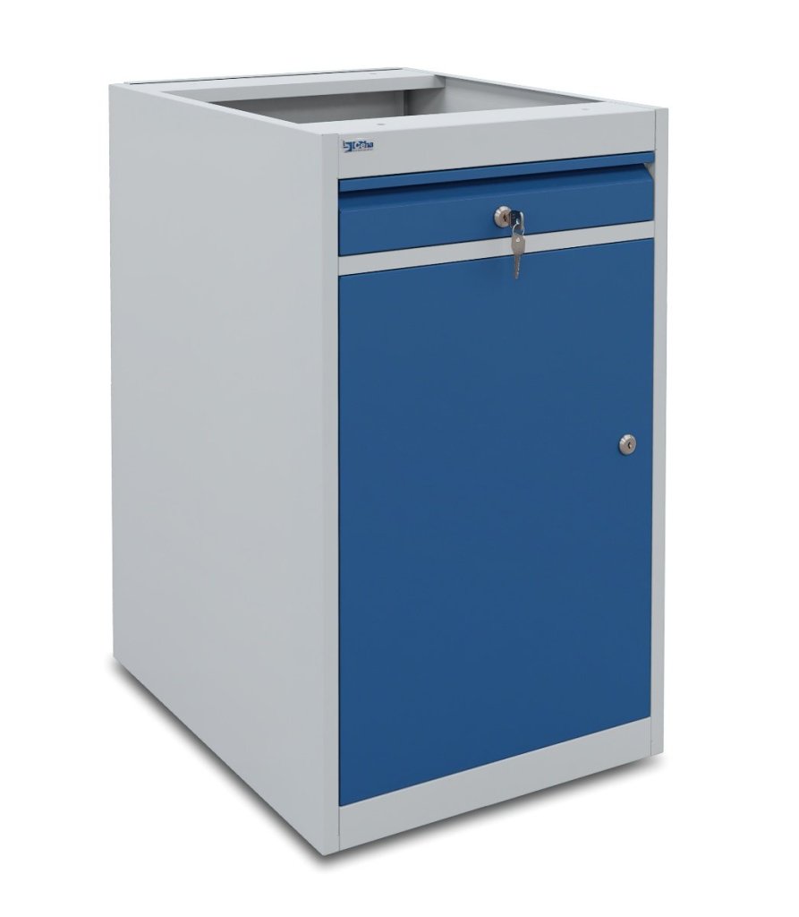 Pracovní deska 40 mm vodovzdorná buková spárovka. 1x podstavný kontejner, výška 810, šířka 461, hloubka 600 mm, 1x noha. Stůl má nosnost 500 kg, výšku 850, šířku 2000, hloubku 750 mm, barva kontejneru šedá RAL 7035/modrá RAL 5010.
