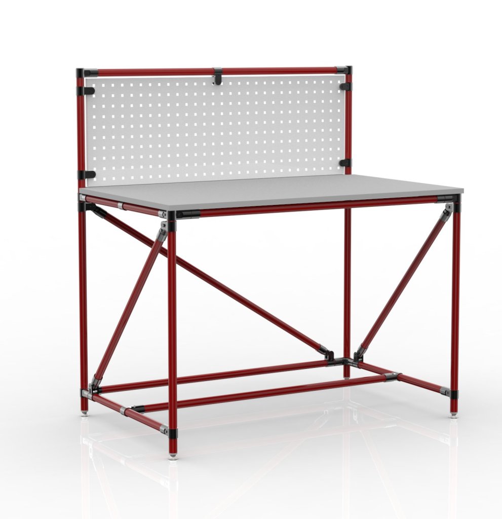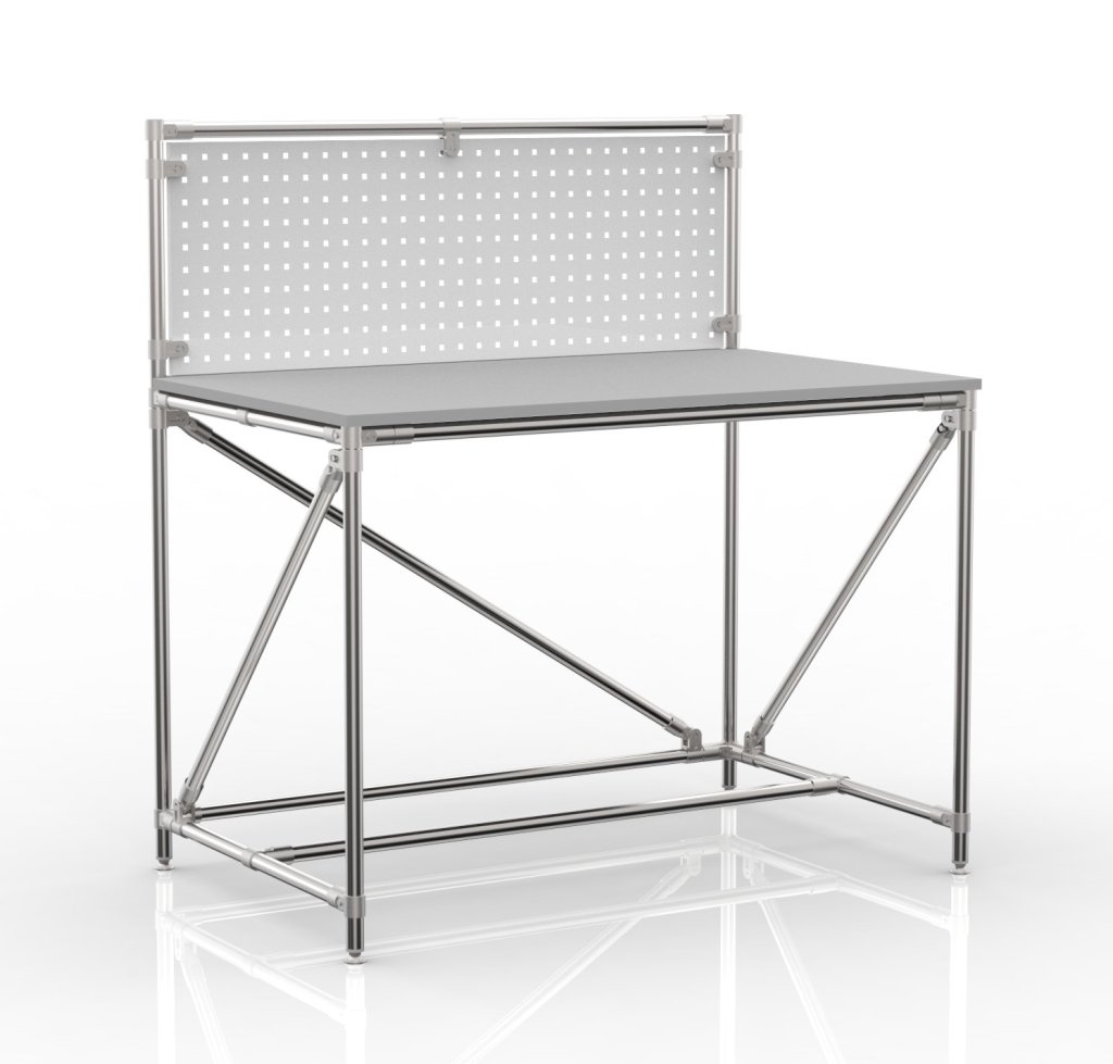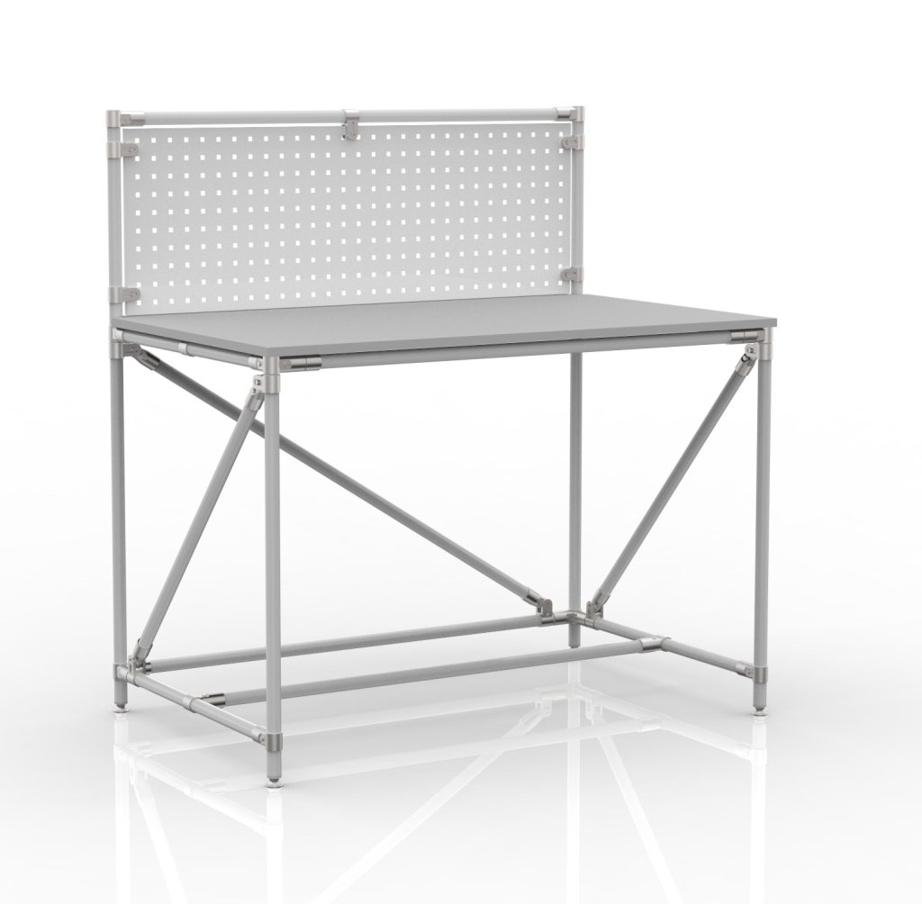 Dílenský stůl s perfopanelem z trubkového stavebnicového systému. Součástí stolu je pracovní lamino deska, perfopanel o rozměrech 1117 x 393 mm a čtyři stavitelné nožičky. Nosnost při rovnoměrném zatížení 100 kg. Rozměry 1282 x 1200 x 750 mm.