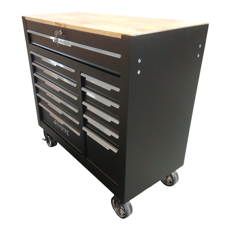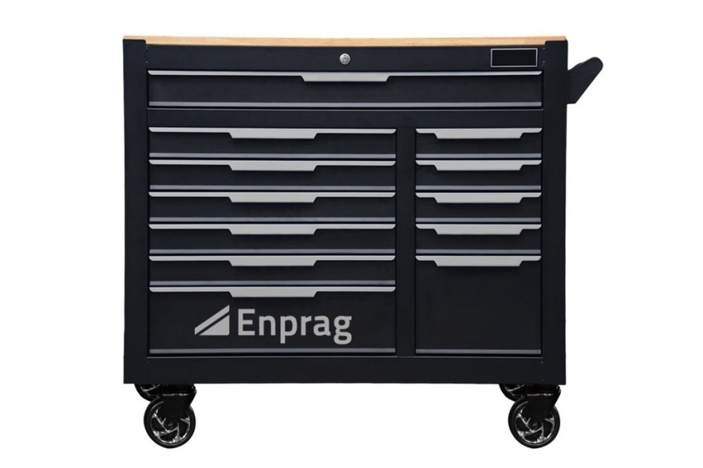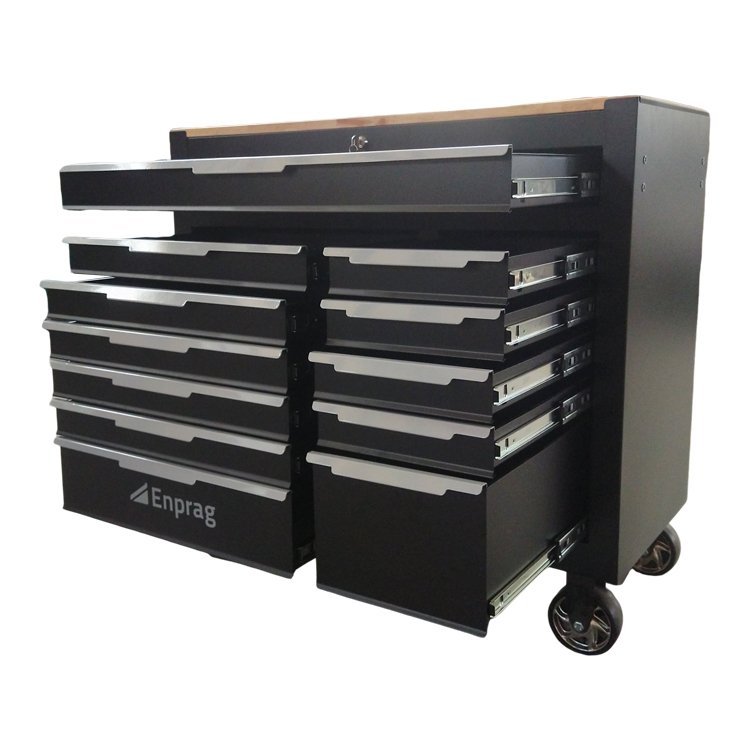 Dílenský servisní vozík - 12x zásuvka. Výška 945 x šířka 972 x hloubka 466 mm. 2 otočná a 2 pevná kolečka, madlo. Barva černá RAL 9017.