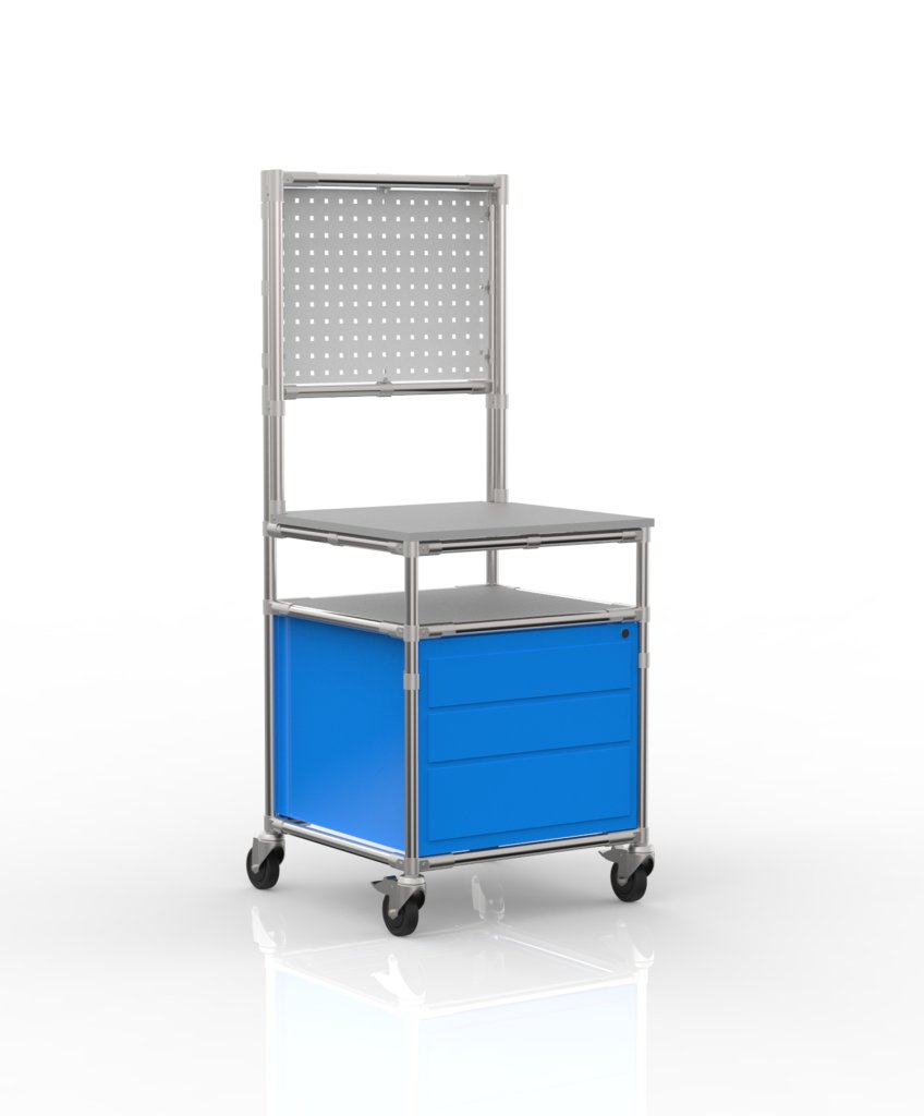 Dílenský vozík na nářadí vyrobený z trubkového stavebnicového systému. Tento vozík je vybaven deskou z laminované dřevotřísky o tloušťce 18 mm, která poskytuje pevnou a stabilní pracovní plochu, nástavbou s perfopanelem, ideálním pro zavěšení boxů či nářadí. Součástí vozíku je dále úložná police, podvěsný kontejner se třemi zásuvkami, pro praktické uložení nářadí, dvě otočná kolečka s brzdou a dvě otočná kolečka bez brzdy o průměru 100 mm pro snadnou manipulaci. Celková nosnost 150 kg, nosnost patra 75 kg. Rozměry 1600 x 633 x 603, výška pracovní plochy je 850 mm.