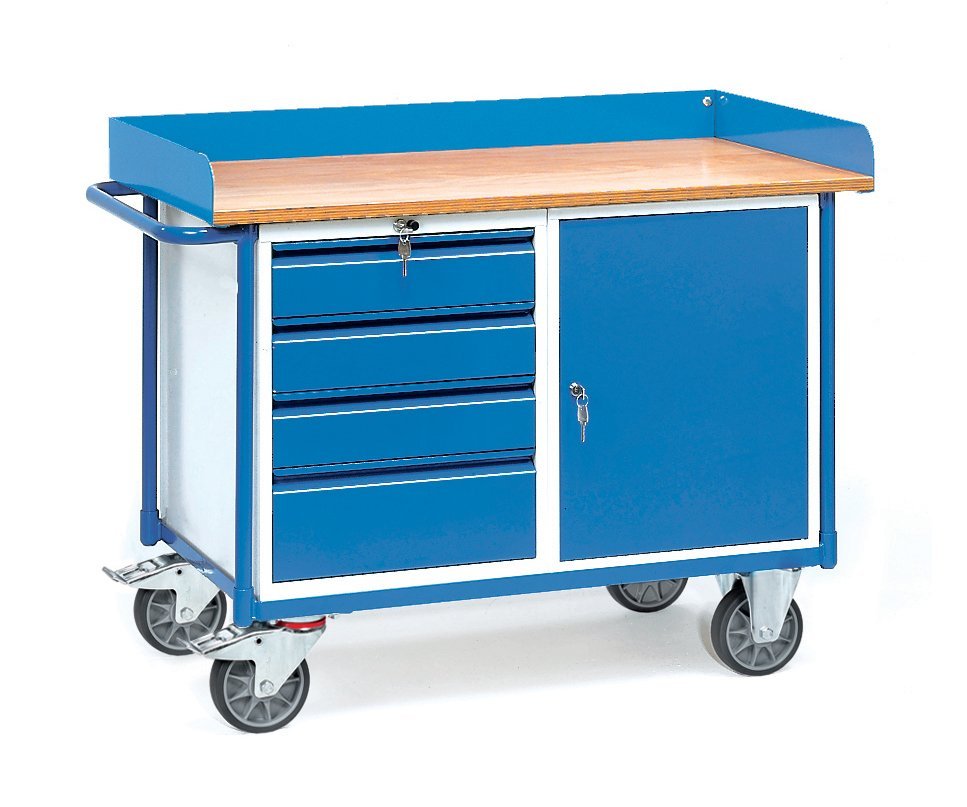 Dílenský pracovní vozík německé výroby, ocelová konstrukce, pracovní plocha je z překližky o síle 22 mm, na třech stranách zvýšený okraj o výšce 80 mm. Vozík se skládá ze skříňky se zásuvkami a přídavné police. 4 speciální pneumatická kolečka Fetra TPE, z toho 2 otočná s brzdou, 2 pevná. Totalstop - centrální brzdový systém Fetra.
