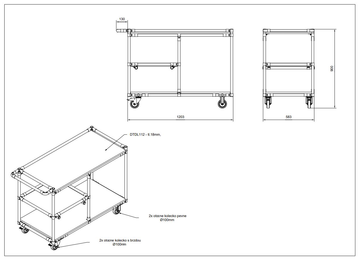 Dílenský pracovní vozík vyrobený z trubkového stavebnicového systému. Tento vozík je vybaven deskou z laminované dřevotřísky o tloušťce 18 mm, která poskytuje pevnou a stabilní pracovní plochu. Součástí vozíku jsou čtyři kolečka o průměru 100 mm. Celková nosnost 250 kg, nosnost patra 100 kg. Rozměr 900 x 1333 x 583 mm.