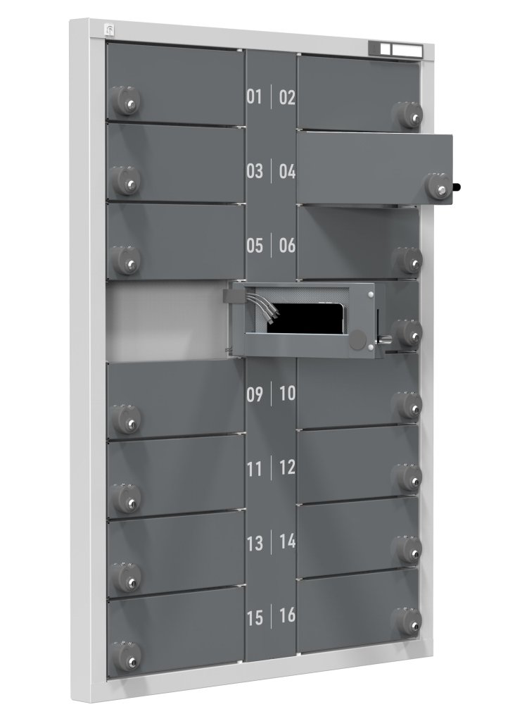 Dobíjecí skříň pro mobilní telefony, umožňuje dobití až 16 mobilních telefonů najednou. Výška 1155 x šířka 830 x hloubka 57 mm. 3 různé konektory s bezpečnými dobíjecími kabely - mikro USB, USB-C a Apple lighting. Vnitřní prostor boxů je vyložen 3D textilií pro komfortní uložení. Zamykání cylindrickým nebo mincovním zámkem.