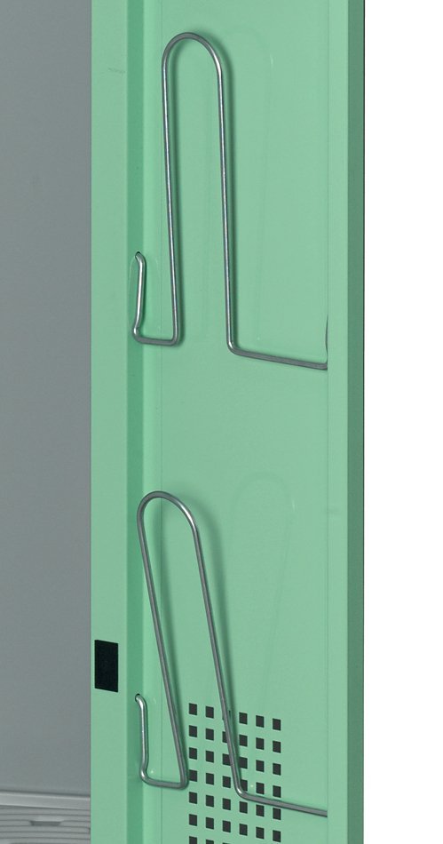 Zamykání - standardně je šatní buňka uzamykána jednobodovou závorou s cylindrickým zámkem a dvěma klíči. Možná je též náhrada zámku otočným uzávěrem pro visací zámek bez příplatku. |