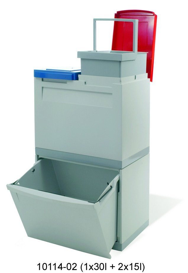 Flexibilní a variabilní. Sektorový princip umožňuje vytvářet různé sestavy. Moduly položené na sobě jsou kvůli stabilitě vzájemně fixovány. Vnitřní koše lze snadno vyjmout, vyprázdnit a vyčistit. Moduly lze doplnit o kolečka. Objem 1 x 30 l + 2 x 15 l.