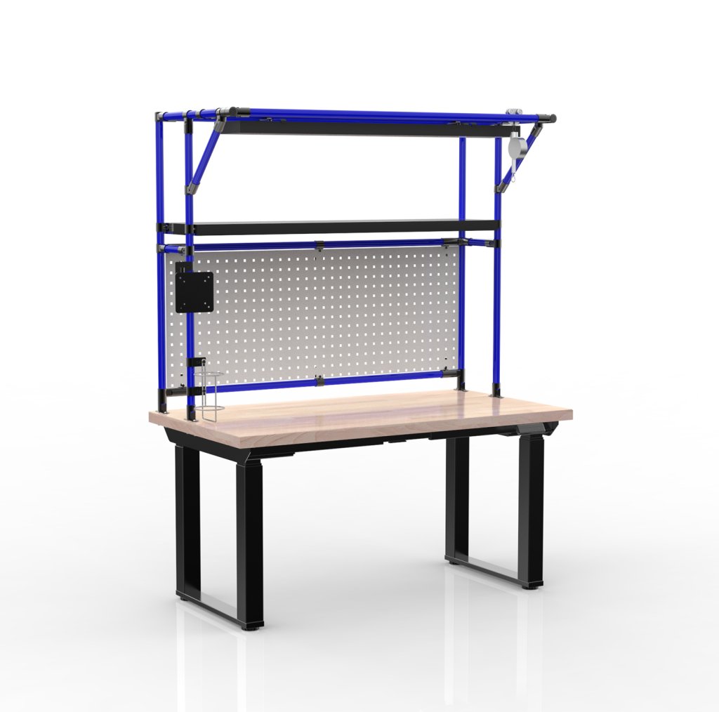 Elektricky výškově stavitelný pracovní stůl s pracovní deskou z bukové spárovky, součástí stolu je perfopanel pro zavěšení boxů či celý popis a parametry