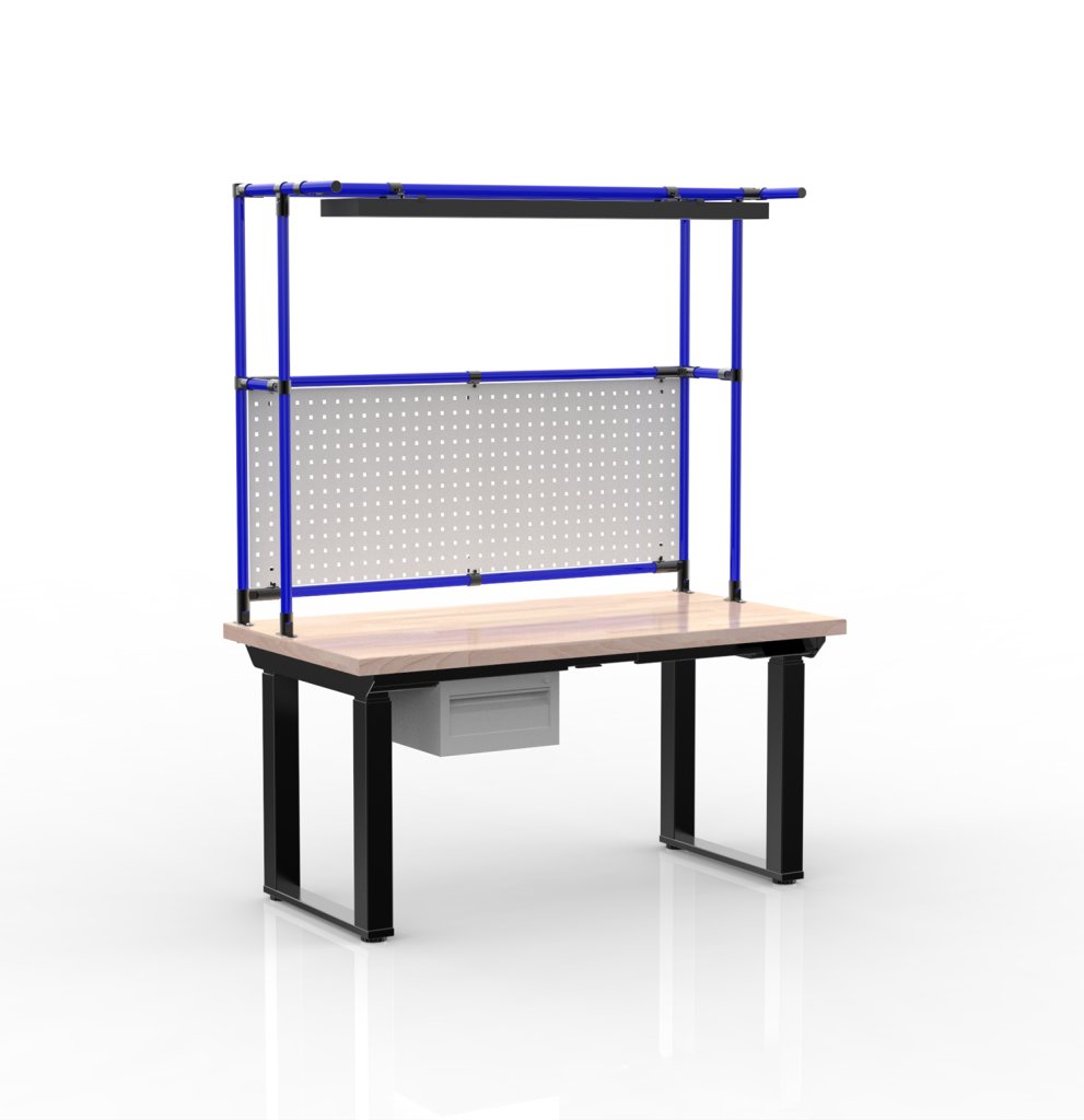 Elektricky výškově stavitelný balící pracovní stůl s pracovní deskou z bukové spárovky, součástí stolu je kontejner s jednou zásuvkou, perfopanel pro zavěšení boxů či nářadí a LED osvětlení. Výška pracovní plochy je nastavitelná v rozmezí 700 - 1350 mm. Nosnost při rovnoměrném zatížení je 250 kg. Rozměry 1800 - 2450 x 1400 x 750 mm.