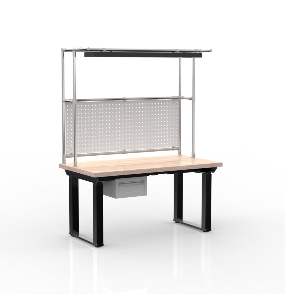 Elektricky výškově stavitelný balící pracovní stůl s pracovní deskou z bukové spárovky, součástí stolu je kontejner s jednou zásuvkou, perfopanel pro zavěšení boxů či nářadí a LED osvětlení. Výška pracovní plochy je nastavitelná v rozmezí 700 - 1350 mm. Nosnost při rovnoměrném zatížení je 250 kg. Rozměry 1800 - 2450 x 1400 x 750 mm.